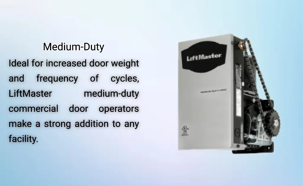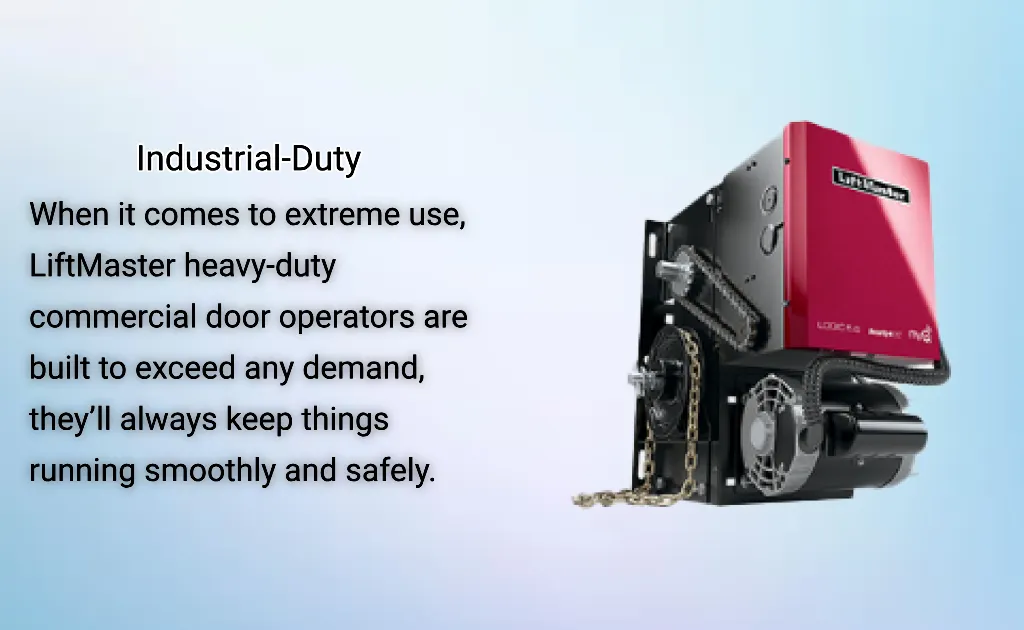Beyond home garage systems, LiftMaster produces a complete lineup of commercial operators designed for demanding environments such as warehouses, loading docks, automotive centers, and industrial facilities. These operators are built for high-cycle use and are compatible with advanced access control systems.
